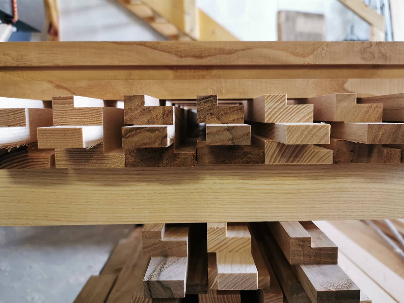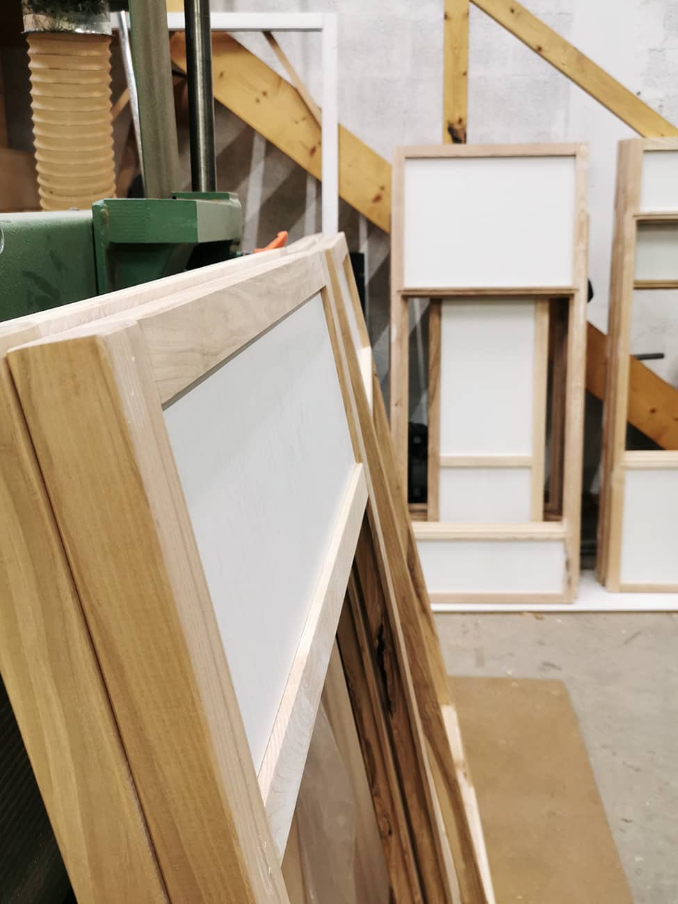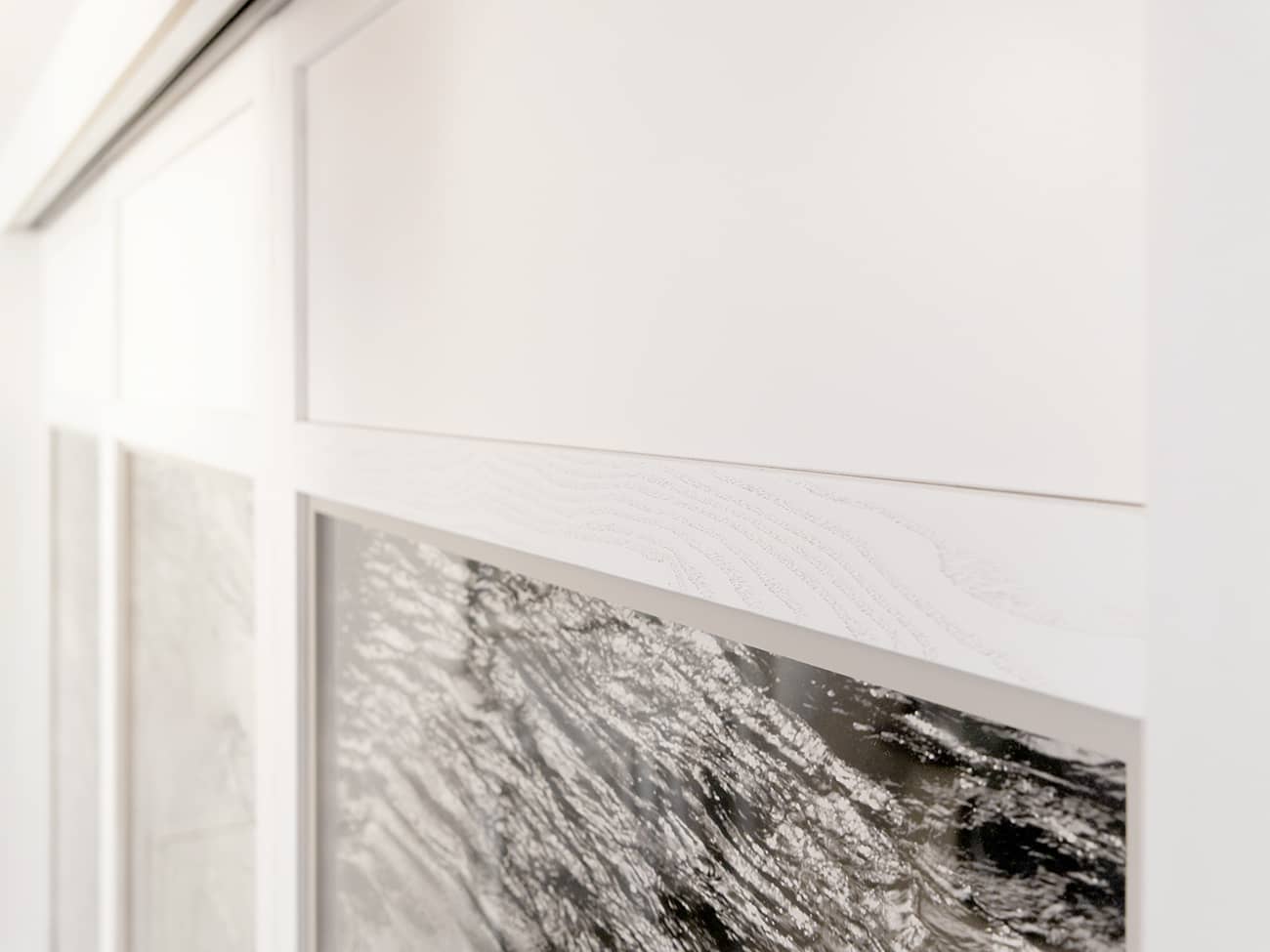 Les parois sont en frêne massif laqué en blanc puis vernis en PU bi-composant, elles coulissent sur des rail haut et bas. L’ensemble des photos est rapportées par l’intérieur et sont maintenues par des parclose en frêne vissée.