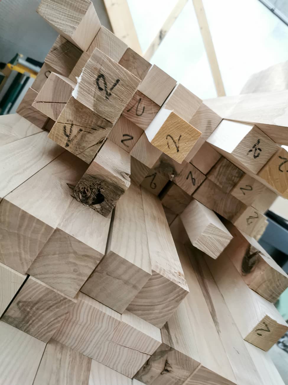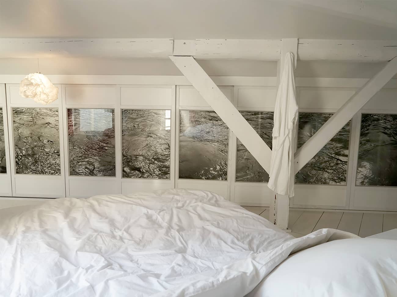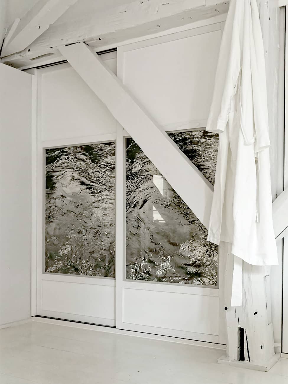 Les parois sont en frêne massif laqué en blanc puis vernis en PU bi-composant, elles coulissent sur des rail haut et bas. L’ensemble des photos est rapportées par l’intérieur et sont maintenues par des parclose en frêne vissée.